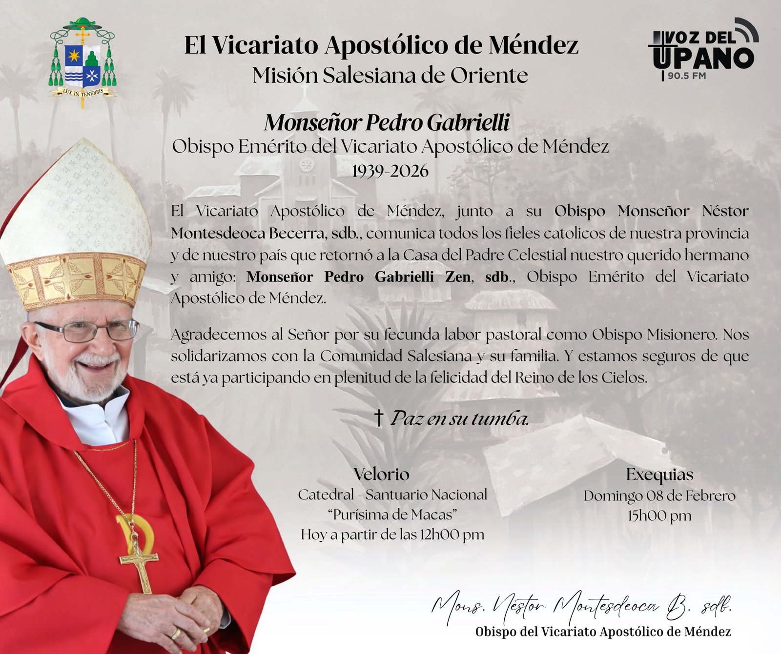 El Vicariato Apostólico de Méndez, junto a su Obispo Monseñor Néstor Montesdeoca, sdB., comunica todos los fieles catolicos de nuestra provincia y de nuestro país que retornó a la Casa del Padre Celestial nuestro querido hermano y amigo: Monseñor Pedro Gabrielli, sdB., Obispo Emérito del Vicariato Apostólico de Méndez..... Ver más